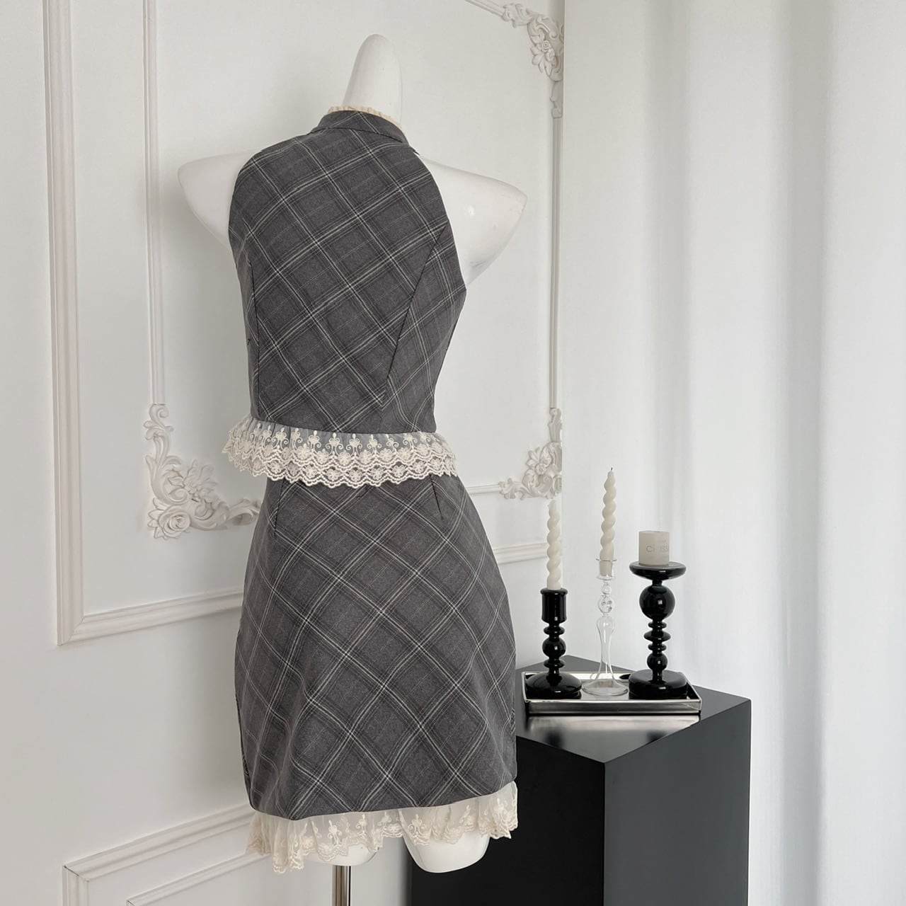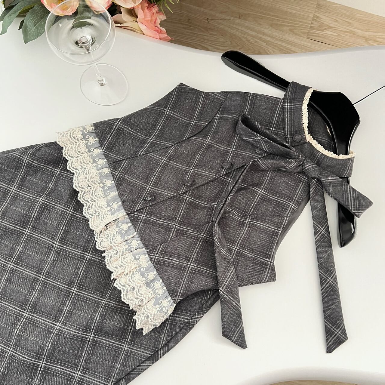 クラシカルなチェック柄に、繊細なレースとリボンタイを組み合わせた、レディなムード漂うセットアップ。