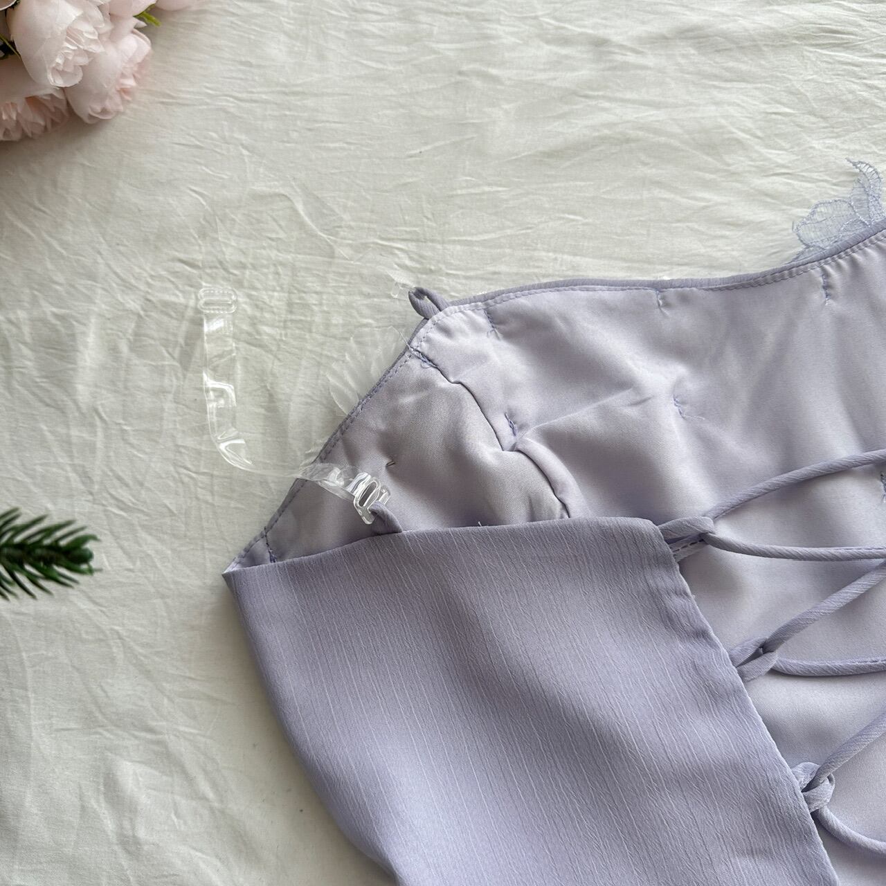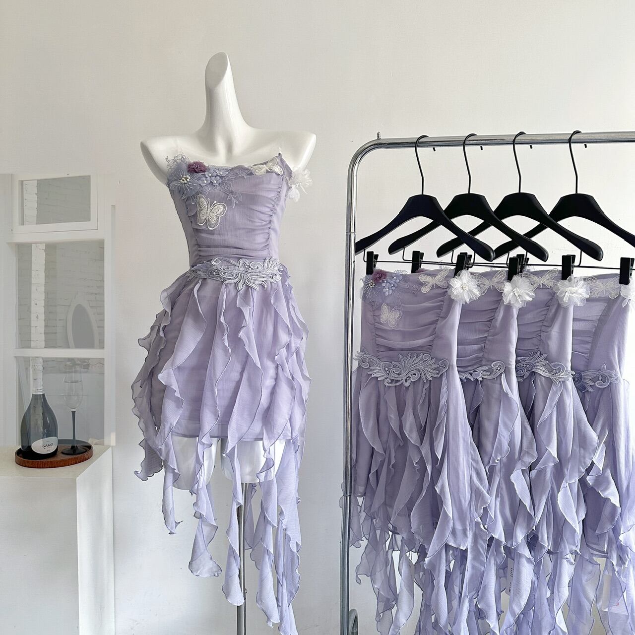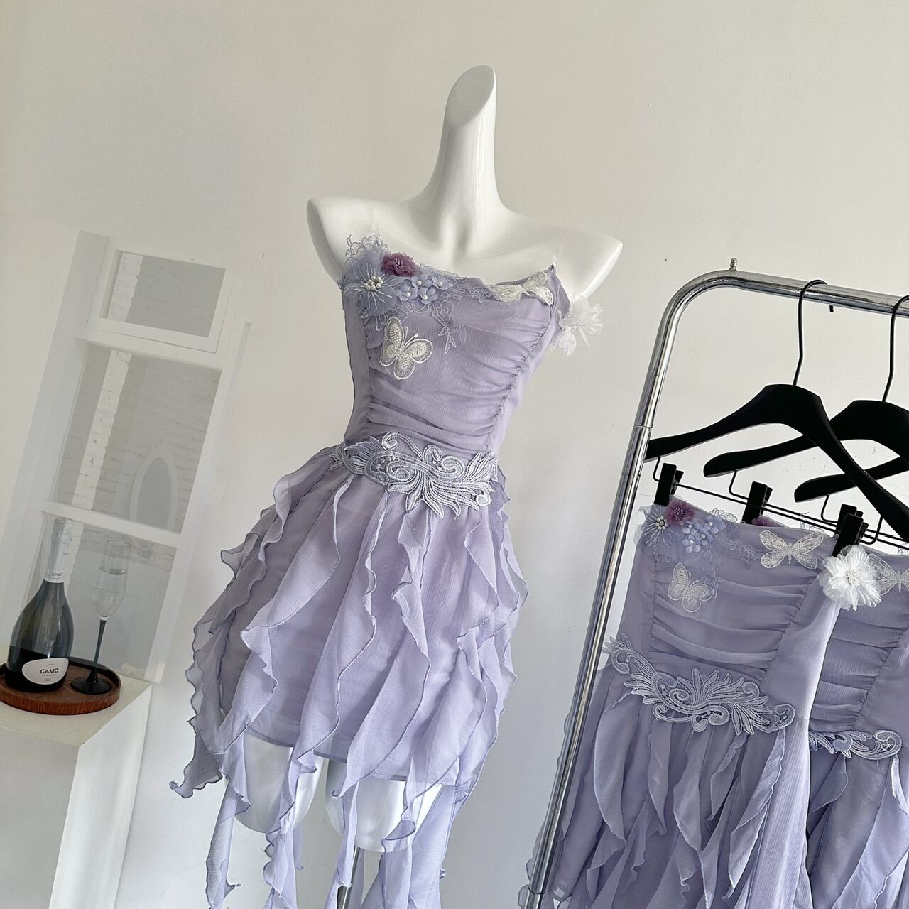 淡いラベンダーに、花と蝶のレースモチーフをあしらった、まるで物語から抜け出したようなドレス。